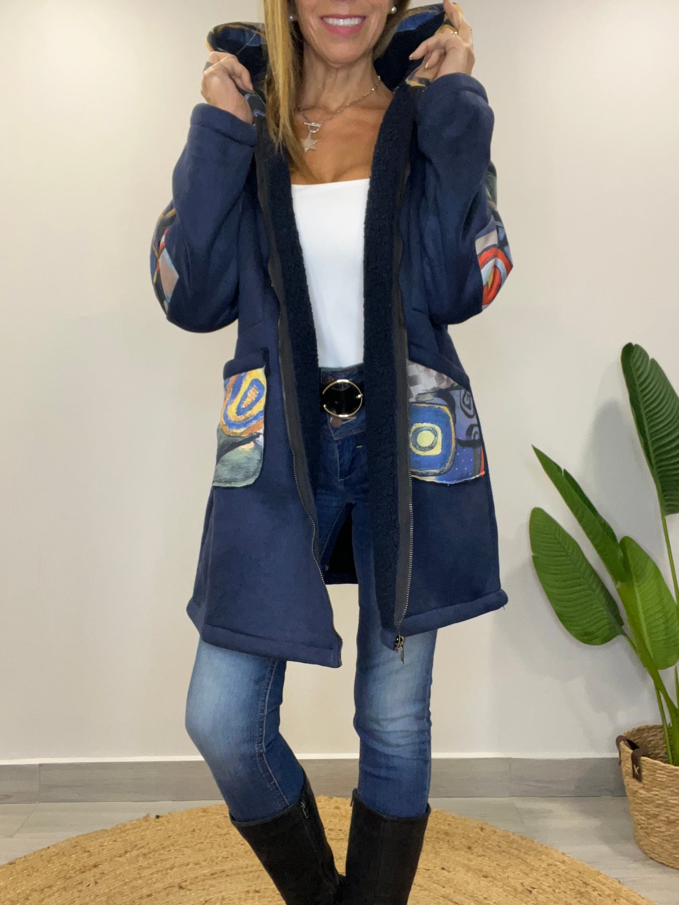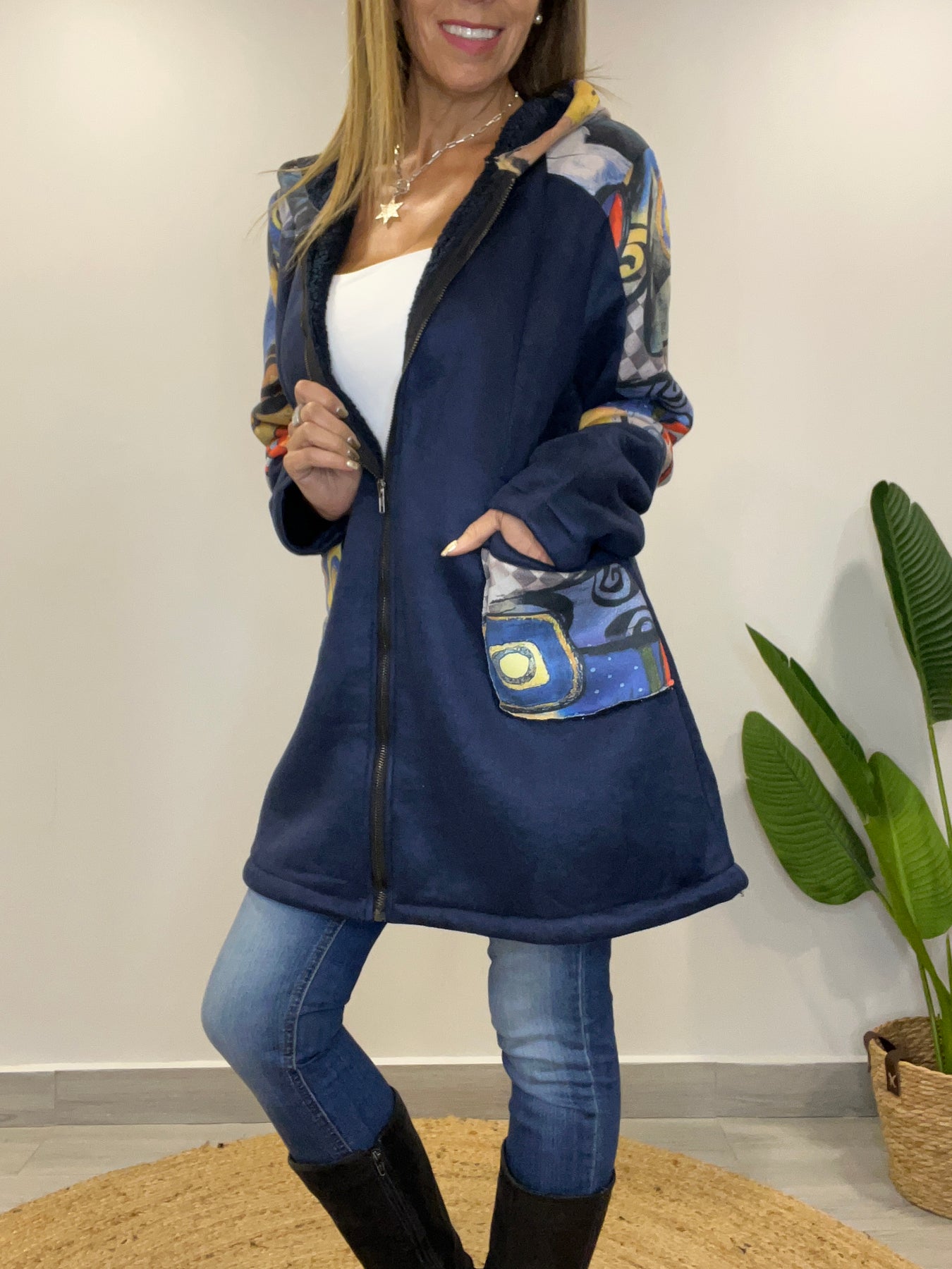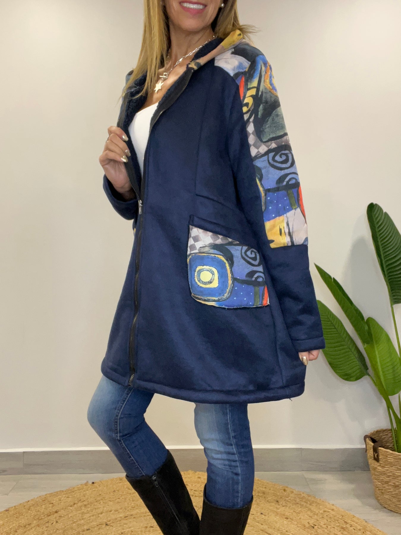 • Tiene cierre, capucha y bolsillos