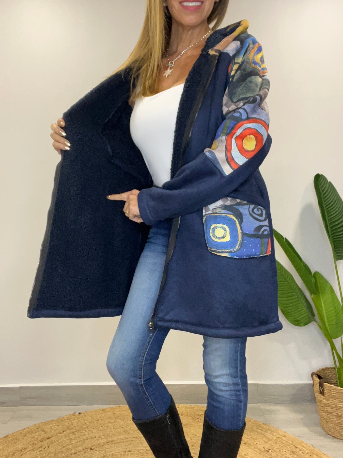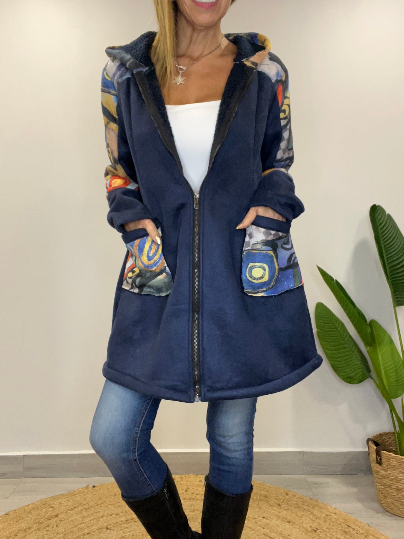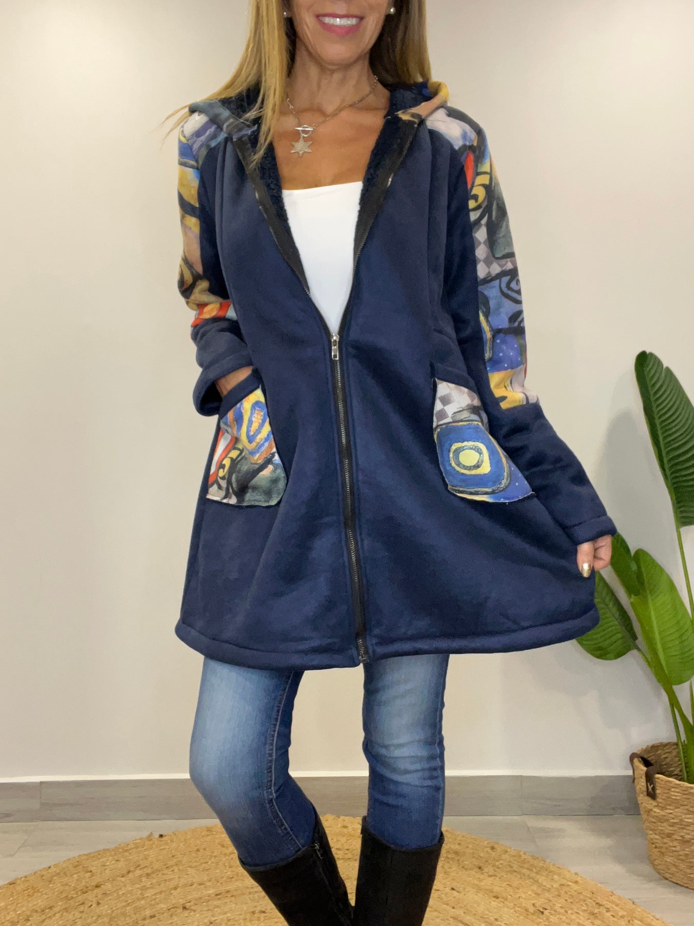 • Tiene cierre, capucha y bolsillos