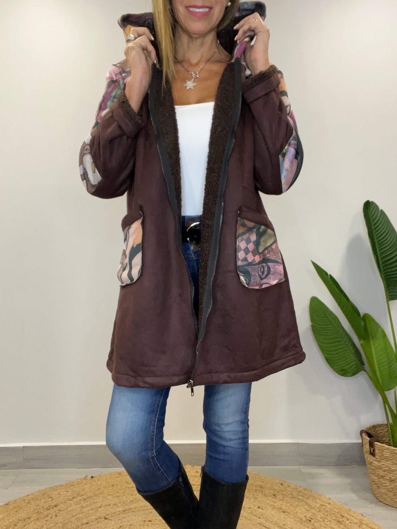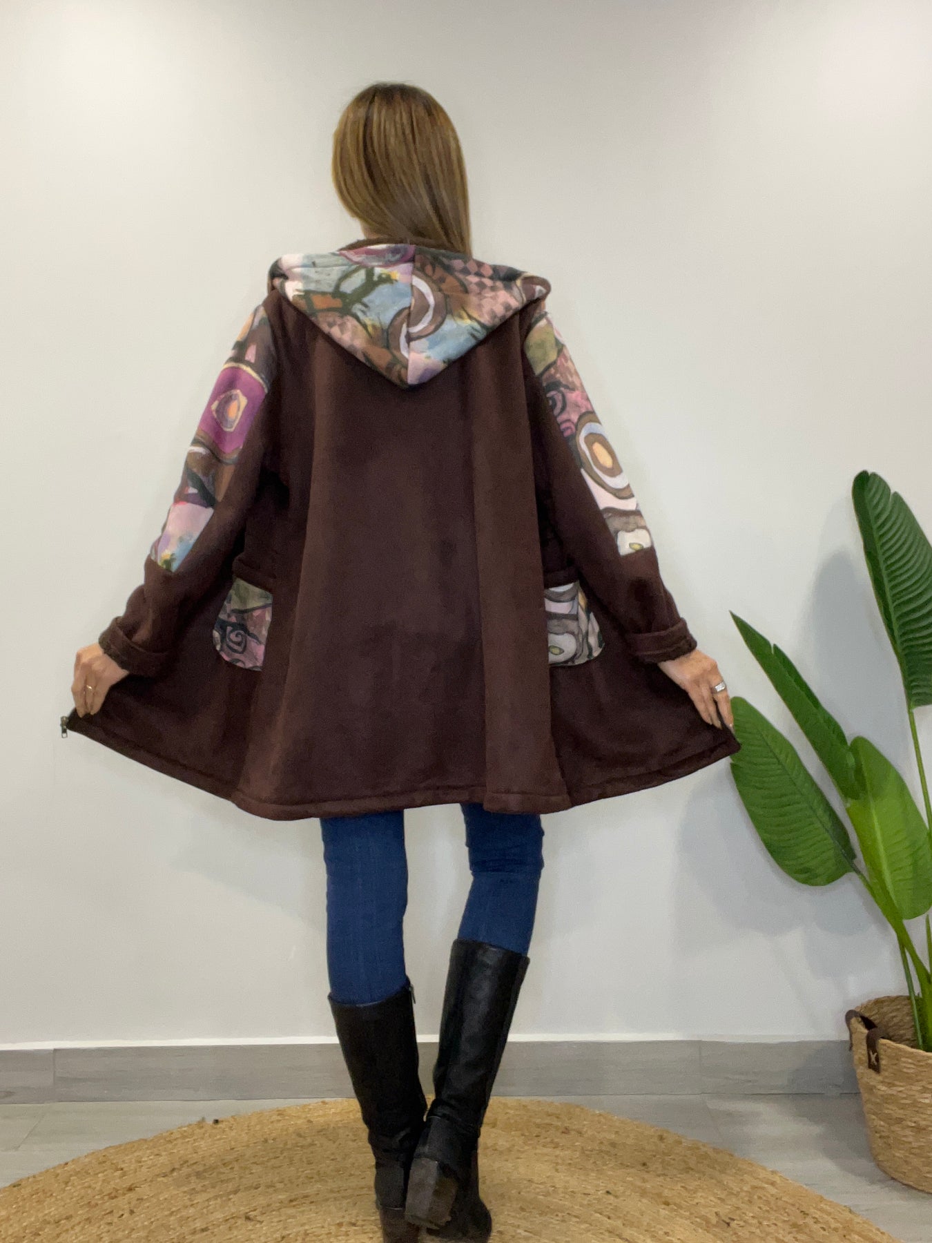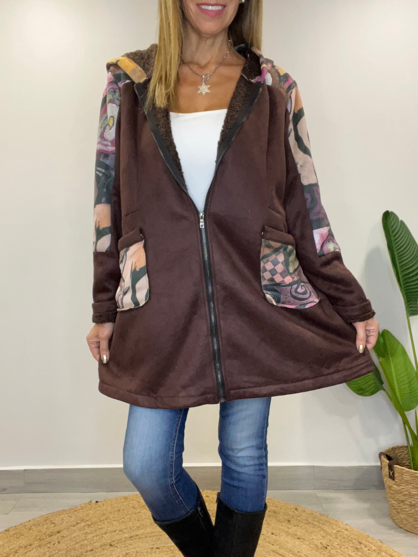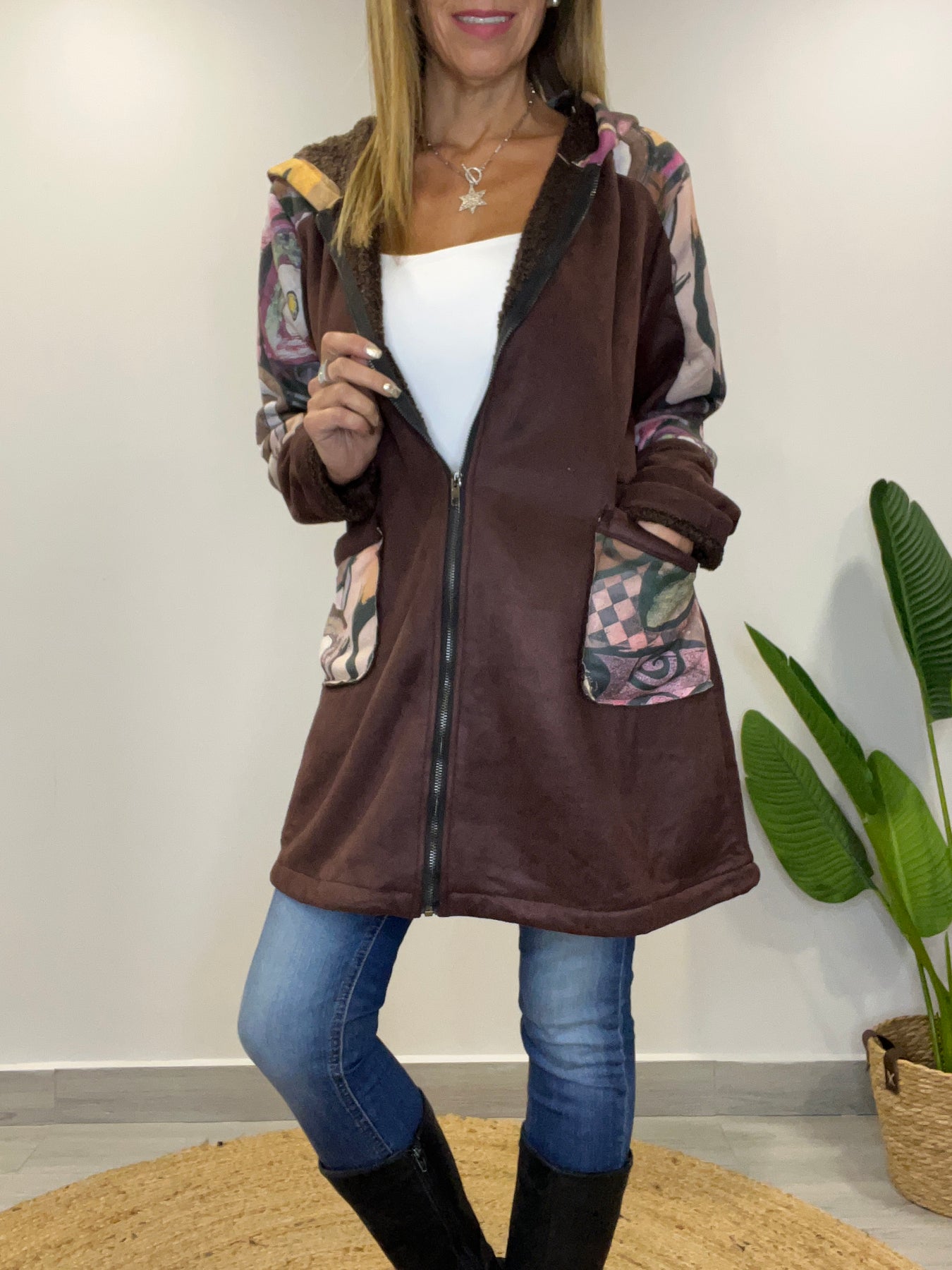 • Tiene cierre, capucha y bolsillos
